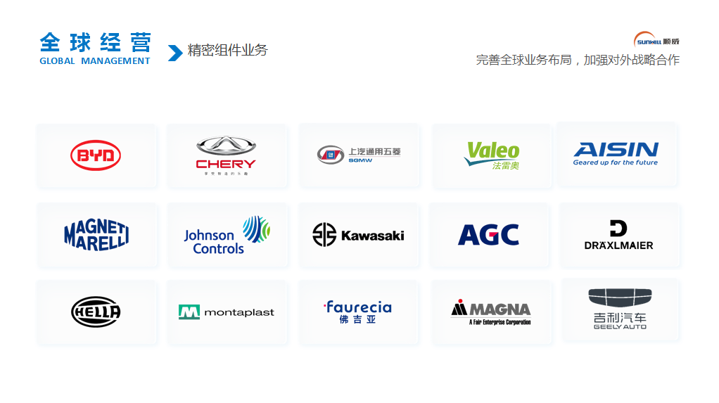精密組建事業(yè)部,依托集團“塑料改性—模具設(shè)計制造—精密注塑”產(chǎn)業(yè)鏈一體化優(yōu)勢,為客戶提供精密塑料件、包覆件、總成裝配件、車燈鍍鋁件等高品質(zhì)產(chǎn)品。